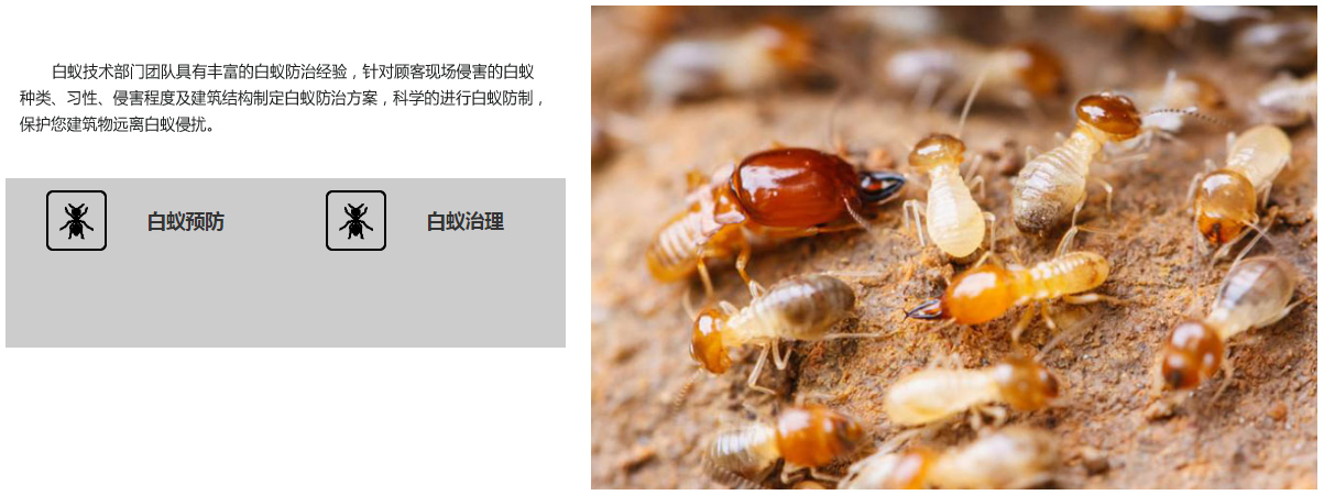 技術部門團隊具有豐富的白蟻防治經驗,針對顧客現場侵害的白蟻種類、習性、侵害程度及建筑結構制定白蟻防治方案,科學的進行白蟻防制,保護您建筑物遠離白蟻侵擾。